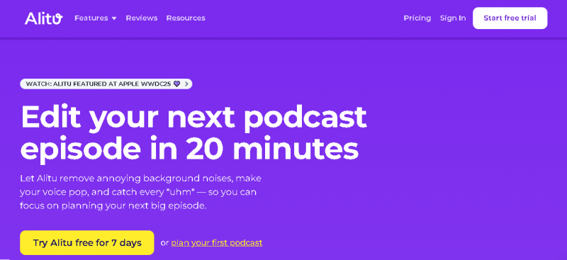 Users upload or record audio, apply automatic cleanup, edit content, add music or transitions, and publish episodes directly through Alitu’s hosting and distribution tools.