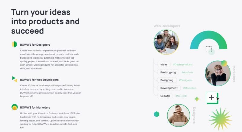 BOWWE (bowwe.com) is a no-code/low-code website builder that lets you design highly customizable websites, landing pages, microsites, portfolios, and CVs with a drag-and-drop editor plus optional custom code.