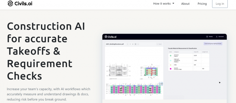 Civils.ai provides AI workflows that measure areas, lengths, volumes, and counts from PDF drawings using plain English descriptions. It covers groundworks, landscaping, utilities, concrete, and more, including earthworks quantities and subsurface ground conditions from geotechnical reports. An intelligence layer runs checks across drawings, specs, and codes based on typed instructions. Results appear on annotated drawings, with options to download in structured formats. The system processes construction documents to extract quantities and perform compliance checks, with QA review for measurements.