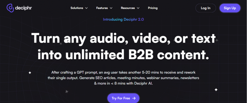 Deciphr AI processes audio or video files to generate transcripts, summaries, show notes, articles, white papers, FAQs, newsletters, landing pages, captions, quotes, chapters, and session recaps. It creates these 75+ content assets from one file in one click without prompts. The tool automates workflows for B2B content by turning existing thought leadership into assets for multiple platforms. Users upload files or URLs to receive outputs in minutes, including AI-generated audio and video reels. Stats show 23K+ users, 2.5M+ minutes processed, and 100M+ words transcribed.