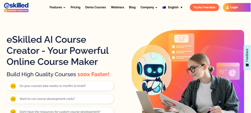 eSkilled AI Course Creator generates complete online courses from simple inputs. It produces structured outlines, syllabi, lesson plans, assessments, and interactive activities. The platform creates AI case studies, quizzes, images, and text-to-speech narration. Content localizes into 80+ languages with regional contextualization. It exports SCORM packages, supports LTI and iframe embedding, and tracks learner progression. An AI assistant handles rapid editing, expansion, and quality consistency. Users access drag-and-drop building, real-time analytics, and flexible sharing options via LMS, SCORM/xAPI, or direct links.