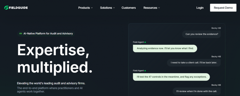 Fieldguide provides an AI platform that automates engagements for advisory and audit firms. Domain-specific AI agents handle workflows across practice areas, methodologies, and engagement types. The platform manages the full engagement lifecycle from scoping and testing to final reports. Document management automatically associates files with controls. Request management tracks client submissions through an automated workflow. Reporting generates outputs in a single click. A client hub aligns teams and clients from request to report. Agentic chat integrates into workflows, understands firm methodologies, and delivers traceable results.