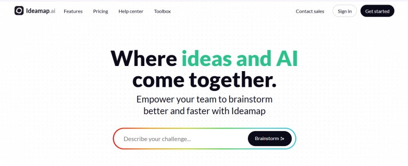 Ideamap provides a platform for brainstorming that incorporates AI tools to generate ideas, visualize them, detect topics, and identify duplicates. It focuses on the workflow of idea creation and collaboration in real-time within workspaces and rooms. Core elements include facilitation tools like agendas and timers alongside AI features such as idea generation and copilots. Sessions conclude with summaries to find best ideas and set next steps. Sharing and embedding options allow distribution of brainstorming results.