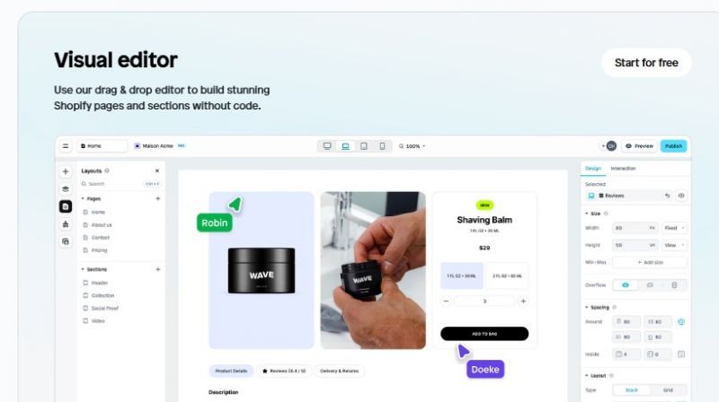 Instant is a visual, no-code builder for Shopify that lets merchants design landing pages, product templates, cart drawers, and entire storefronts on a free-form canvas instead of rigid themes. With built-in support for high-speed funnels, bundles, reviews, and upsells, it focuses on turning traffic into revenue rather than just looking pretty. Its Figma-to-Shopify plugin closes the gap between design and development, pushing production-ready layouts into Shopify in minutes.
