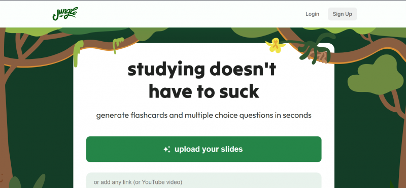 JungleAI generates flashcards and multiple choice questions from lecture slide decks, PDFs, webpages, PowerPoint presentations, YouTube videos, textbooks, study guides, and notes in seconds. It provides personalized feedback during practice. The tool processes uploaded materials to create study aids that support active recall. Users import content and receive generated questions and cards tailored to the input. Supported formats cover common study resources for quick conversion into interactive formats.