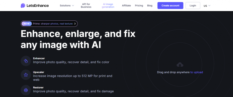 Let's Enhance enables users to improve image quality by recovering lost detail, fixing exposure, sharpening edges, and reducing noise. It reconstructs natural texture and clarity using generative AI, avoiding plastic artifacts or over-processed looks common in other enhancers. The tool processes phone photos, compressed JPEGs, AI art, and old scans through drag-and-drop upload. Users select modes like Prime for portraits and fine textures, Gentle for small text, or upscale options from 1x to expand size while enhancing. Batch processing handles up to 20 images, with specialized algorithms for faces, digital art, balanced enhancement, and color-tone adjustments. Results support print-ready quality at large sizes and cleanup of AI-generated images.