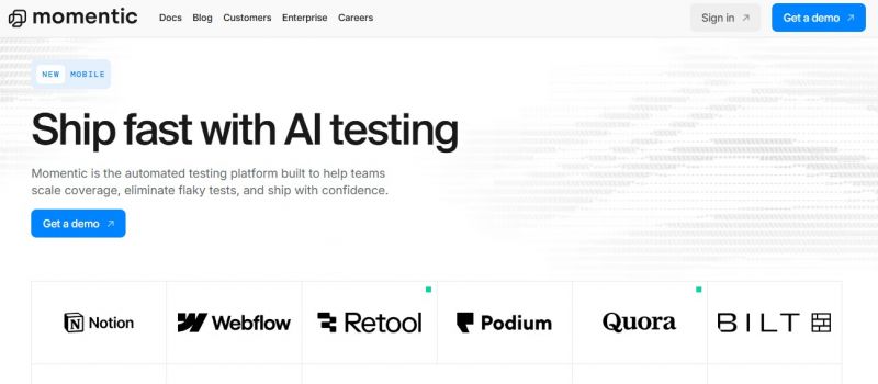 Momentic provides test automation for end-to-end, UI, API, and accessibility testing across web, Android, and iOS apps. Tests use natural language descriptions for element location, assertions, and actions. The platform supports writing tests in plain English, running them locally or in CI/CD pipelines, and generating steps via an editor with interactive browser preview. Differentiation includes self-healing locators based on intent, AI checks for visual and semantic validation, quarantine for flaky tests, and memory from past runs for consistency. Mobile support allows authoring once for multiple platforms with instant feedback.