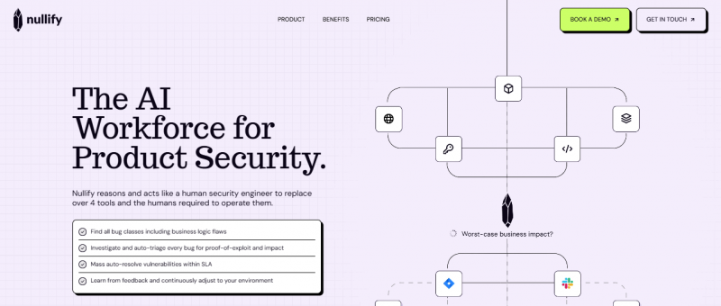 Nullify handles product security from vulnerability discovery to shipping fixes across the entire attack surface. It connects to repositories and cloud accounts to map architecture, including services, APIs, dependencies, and team relationships. Operating continuously, it reviews commits, pull requests, dependencies, infrastructure-as-code, deployed environments, and external services. Findings undergo investigation for reachability and exploitability before triage. It manages security backlogs by tracking threats, team capacity, and priorities, then opens pull requests with patches matching codebase patterns. When issues arise in CI or reviews, it analyzes logs, updates code, and escalates as needed.