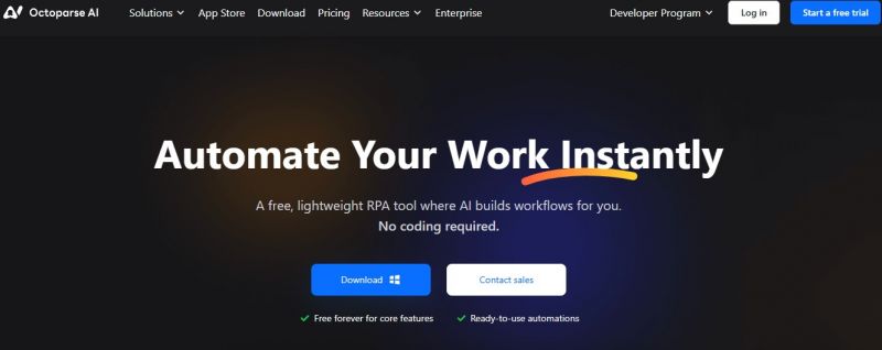 Octoparse AI combines RPA with AI to add intelligence to workflows across websites, Excel, and desktop applications. It automates tasks such as scraping data from web pages, processing it in Excel, and inputting results into internal systems. The platform supports building workflows through natural language, drag-and-drop, or code, with AI Copilot enabling automation without IT involvement. Features like Generative AI, OCR, and CAPTCHA solving embed AI directly into processes. It handles platforms without APIs by automating web portals or form filling. Automations run 24/7 without human intervention.