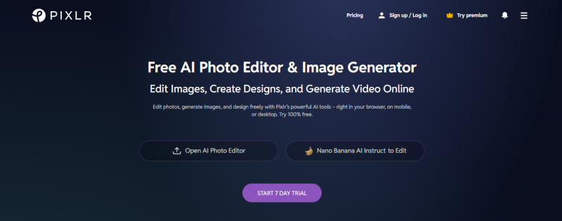Pixlr provides online photo editing, image generation, and design capabilities through browser, mobile, and desktop access. It supports workflows for editing photos, generating images, and creating designs with AI tools such as AI Image Generator, AI Generative Fill, AI Generative Expand, AI Background Removal, AI Object Removal, AI Sticker Maker, AI Backdrop, AI Up-Scale, AI Sharpen, AI Denoise, and AI Magic Eraser. Free version offers core features without an account; premium subscriptions unlock additional content, advanced AI tools, and ad-free experience across platforms. A single subscription grants access to all devices, with AI credits for generative features and options to purchase more credits.