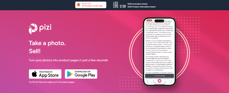 Pizi transforms product photos into complete, professional product pages in under 45 seconds. The tool uses AI to automatically generate detailed descriptions, titles, and SEO-optimized content tailored to each product. Users capture a photo, let Pizi process and enhance it with studio-quality edits, then export the finished product page directly to their online store. The platform saves approximately 1 hour and 20 minutes per product page compared to manual creation. Available in 10 languages and free for WiziShop customers, Pizi integrates with multiple ecommerce platforms including Shopify, WooCommerce, and Prestashop.