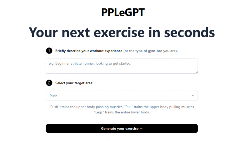 PPLeGPT generates tailored workouts based on your experience and target muscle group. The simple web UI lets you choose your focus area (push, pull, legs) and instantly creates a plan, saving time and simplifying training decisions. It is free and requires no account or download.