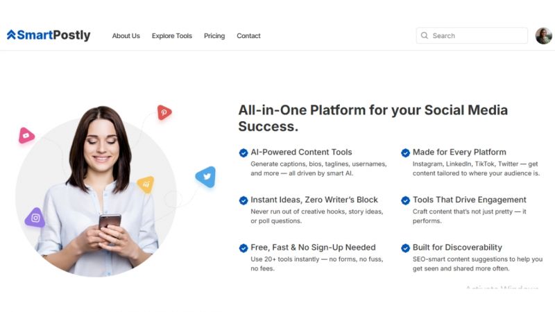 SmartPostly is a platform that offers AI-driven tools to simplify social media content creation and planning. It provides a range of features such as name generation, caption writing, hashtag suggestions, bio creation, tagline drafting, script building, grammar correction, and automated content calendars. These tools are designed to help users reduce repetitive tasks and maintain consistency across different platforms. The platform is positioned as more than just a content generator. Its focus is on improving productivity and time management by streamlining the workflow of individuals, creators, and businesses who need to manage multiple social media accounts. Instead of relying on separate apps for different tasks, SmartPostly brings these solutions together under one roof.