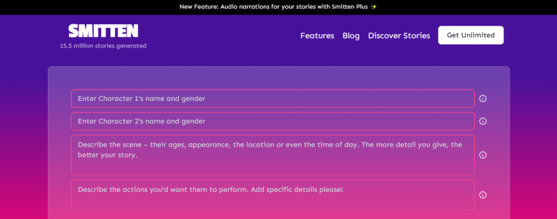 Smitten Stories enables people to craft personalized erotic tales based on custom characters and detailed prompts. At its core, Smitten Stories lets users generate NSFW stories without an account (2 per day free) and upgrade for unlimited access and extended content. The platform includes story libraries and character memories to enhance ongoing creative exploration.