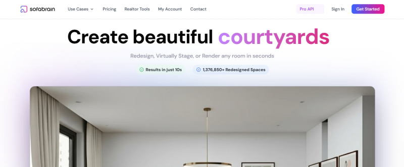 SofaBrain API provides endpoints for AI-powered room redesign, virtual staging, and furniture removal. Developers submit source images with style or room parameters to generate photorealistic visualizations asynchronously. Virtual staging places furniture spatially aware of room dimensions. Decluttering removes objects while reconstructing surfaces. Additional endpoints handle inpainting, upscaling, and 5-second video generation. Integration uses RESTful API with SDKs for major platforms. White-label options allow branding the output.