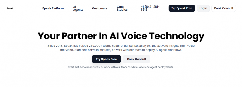 Speak AI provides a platform for capturing, transcribing, analyzing, and sharing voice and video content. It supports teams in processing audio and video into searchable insights through transcription, theme detection, summaries, and exports. The modular setup allows starting with self-serve tools and scaling to white-label embeds, media libraries, or custom AI agents grounded in multimodal knowledge bases. Since 2018, it has served over 250,000 teams with voice analytics integrated into workflows, including structured outputs, routing, and client-facing delivery options.
