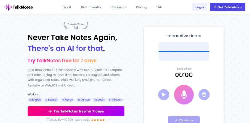 Talknotes transcribes voice notes into structured text such as task lists, transcripts, blog posts, newsletters, and video scripts. Users record thoughts or upload audio files, then select from over 100 premade styles or create custom ones to format the output. The process involves recording, choosing a style, editing, and sharing or exporting the result. It supports iOS and Android apps, web access with real-time sync, 50+ languages with auto-detection, and file uploads up to 20 minutes on Plus or 2 hours on Pro plans. Content generates from ideas or ramblings in seconds for publishing.