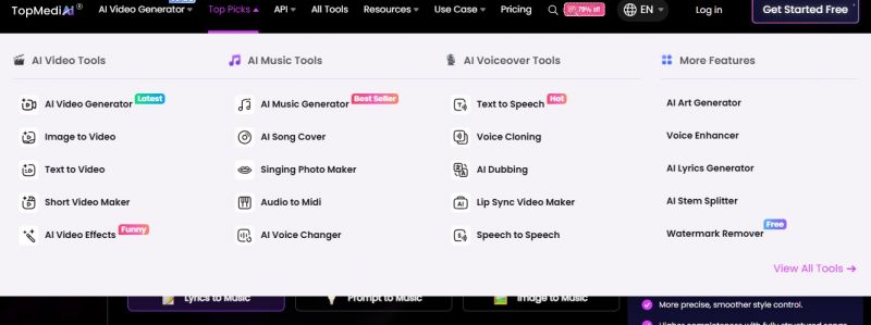 TopMediai is an media creation platform that helps users produce videos, music, and voiceovers with generative tools. At its core, the system transforms text and images into professional‑style video content using advanced AI models. It also offers original music generation, realistic text‑to‑speech, voice cloning, and song cover creation. The platform is web‑based, beginner‑friendly, and includes APIs for developers, making it useful for content creators, marketers, educators, and developers seeking an all‑in‑one AI creative solution.