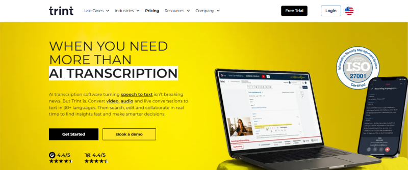 Trint transcribes audio and video files to time-coded text up to 99% accurate with good audio and clear speech. Users review, edit, search, and share transcripts like cloud-based documents. The platform supports batch uploads in 40+ languages, speaker detection, and custom dictionaries for formats including MP3, MP4, M4A, AAC, WMA, AVI, WAV, and MOV. Live transcription captures interviews, speeches, video calls, or microphone input in real time. Generative AI provides customizable summarization of transcripts. Teams collaborate with simultaneous editing, version history, and granular access levels. Translation extends to over 70 languages, including live multi-language recognition and transcription.
