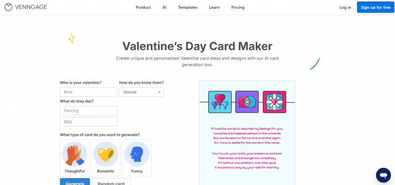 Venngage Valentine's Day Card Maker enables creation of custom Valentine's Day cards using AI. Users generate funny, thoughtful, or romantic designs for partners, crushes, or friends from templates. Key options include Generate from HEX, where recipient details like name and interests produce tailored cards, and Randomize for spontaneous designs. The tool provides extensive templates customizable via a drag-and-drop interface for colors, fonts, icons, photos, and text. It simplifies card design without requiring skills, allowing quick personalization and output for sharing, emailing, or printing.